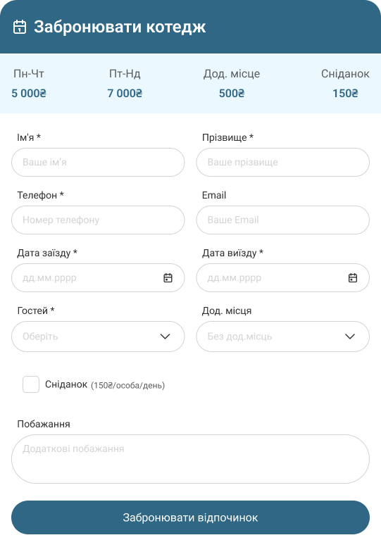 Залиште свої контакти, і ми зв'яжемося з вами найближчим часом, щоб підібрати вільні дати та ідеальний котедж для вашої компанії.